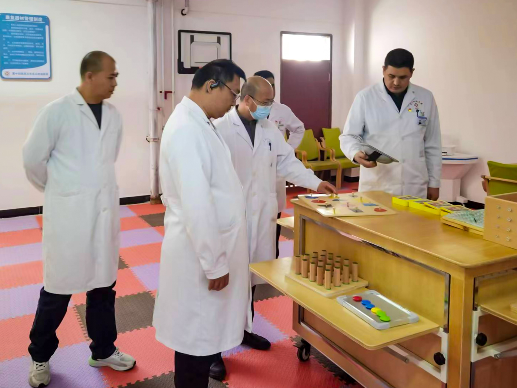 在皮山農場醫院,團隊成員為皮山農場醫院患者開展了義診活動。田衛東對腦血管病患者進行查體后,提出了針對性診療建議。隨后,田衛東一行人參觀了皮山農場醫院的中醫中藥特色館和康復訓練中心,表示皮山農場醫院變化巨大,硬件設施逐步完善,醫療水平也得到很大提高。