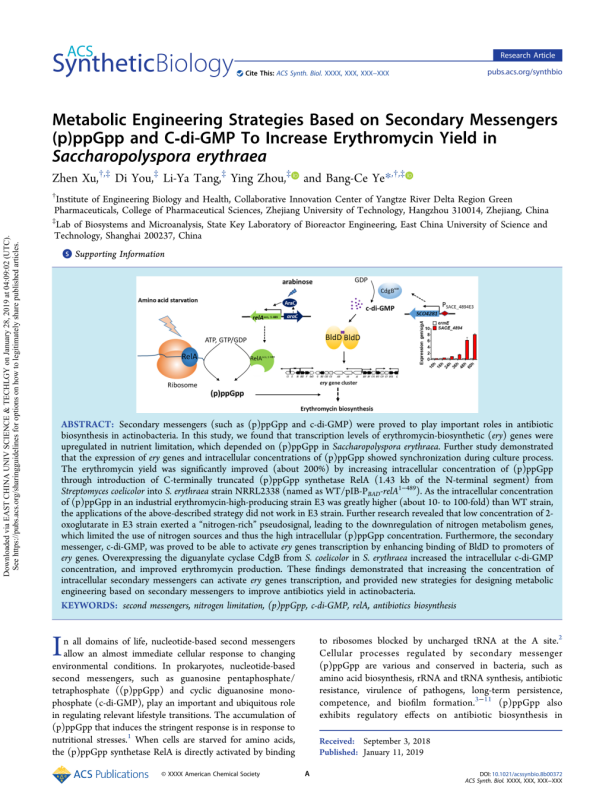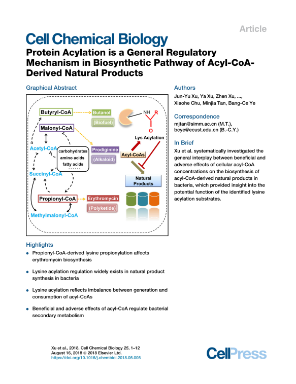我校化學化工學院葉邦策研究團隊,在NSFC-重點項目(批準號:31730004)的資助下,聚焦合成生物學研究領域中工程化設計的生物合成體系與細胞整體代謝網絡的交互作用及適配性機制等關鍵科學問題,開展以翻譯后修飾調控為特色的高效微生物合成體系工程化設計與優化理論方法的應用基礎研究,解析營養代謝、前體供應及酰基化修飾機制,建立了基于翻譯后修飾的代謝工程(PTM-ME)策略(圖1),揭示第二信使在酰基化修飾及抗生素合成調控中的作用(圖2),開發了基于酰基化修飾調控原理的新型翻譯調控元件和基因編輯元件(圖3),并積極致力于成果轉化。研究成果在Cell Chem Biol、Mol Cell Proteomics、Mol Microbiol、ACS Chem Biol、ACS Synth Biol、J Bacteriol等國際高水平期刊發表53篇。申請發明專利6項,部分成果已經產業化應用,2022年已合作融資5000萬元,部分工程化菌種開始產業化實施。基于紅霉糖孢菌的營養及翻譯后修飾調控機制的代謝工程改造策略正在與新疆川寧生物技術公司合作,提高紅霉素發酵產量。培養博士后2名,培養博士研究生 17名,碩士研究生18名,參加國內外學術大會報告10余次。研究成果在微生物翻譯后修飾代謝調控的研究和合成生物學應用中發揮了重要作用。