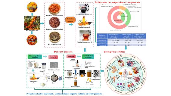 沙棘油(SBO)是一種富含生物活性成分的功能性油脂,其提取技術、化學組成、生物活性以及載體遞送技術等方面受到了廣泛關注。離心分離和超臨界二氧化碳萃取是沙棘油提取的主要商業化技術。沙棘籽油富含亞油酸、亞麻酸和植物甾醇,主要用于保肝、增強免疫力和美白皮膚;沙棘果油富含棕櫚油酸和類胡蘿卜素,主要用于改善胃腸功能和抗炎。作為一種食品、保健品和藥品的寶貴資源,沙棘油在體外和體內研究中均顯示出顯著的功效。為了提高沙棘油的穩定性和生物利用度,乳化技術和微囊化技術被廣泛應用。未來的研究應聚焦于優化提取工藝、開發新型載體系統以及開展高質量的臨床試驗,以驗證其劑量-效應關系和安全性,從而推動沙棘油的工業化應用。